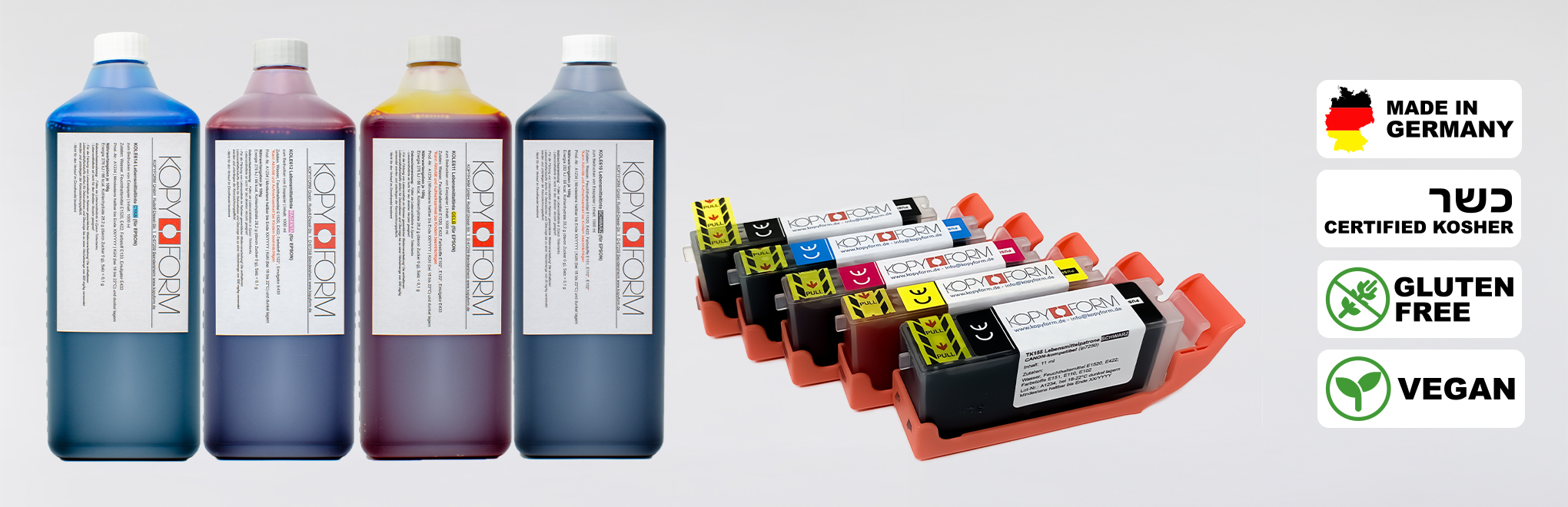 Our KOPYFORM Edible Ink – Made in Germany – is compatible with Canon and Epson printers. It offers intense colors, brilliant resolution and is durable for up to 24 months. Perfectly matched to our edible papers and transfer sheets.