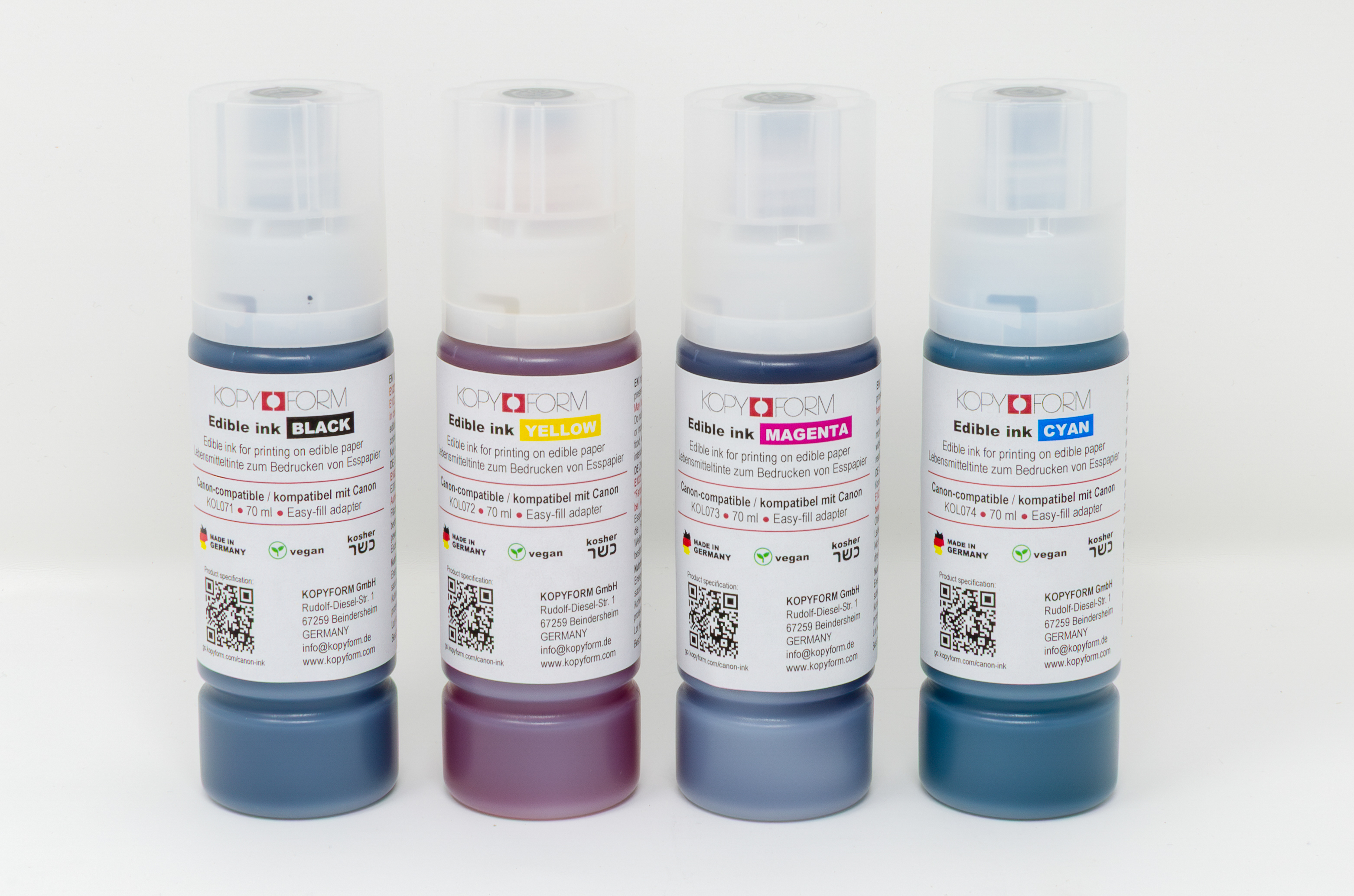 - Edible ink by KOPYFORM in bottles for CISS systems, Canon ink tank printers, and machine refilling of compatible Canon cartridges